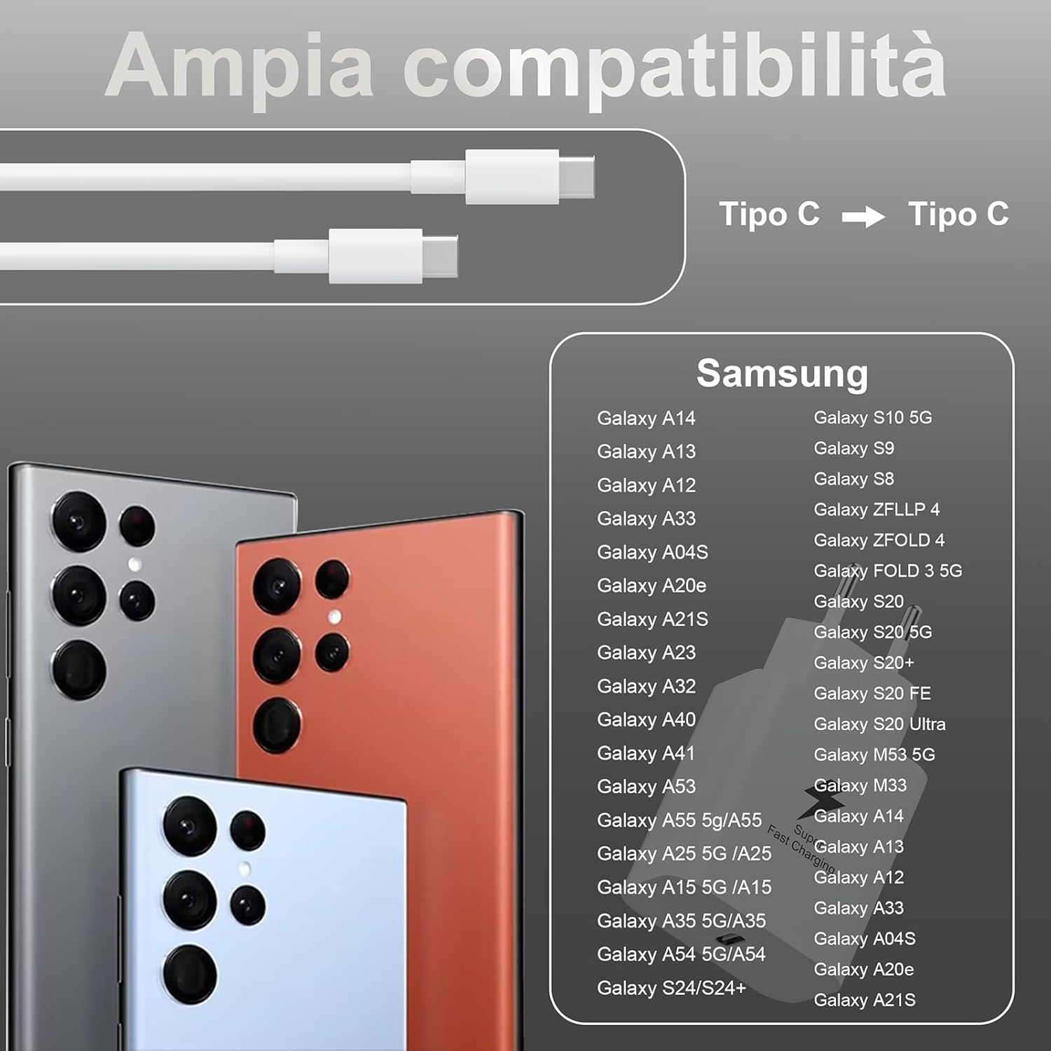 25W Caricabatterie rapido per Samsung Galaxy S24/S23 /Ultra S23+/S23 /S22 /S21/S21 ultra 5g / S20 Ultra/ S20 / S10 /S9 / S8/ A71 / A52 /A51/ A32/ A31 Con 2M Cavo USB Tipo C (Bianco)