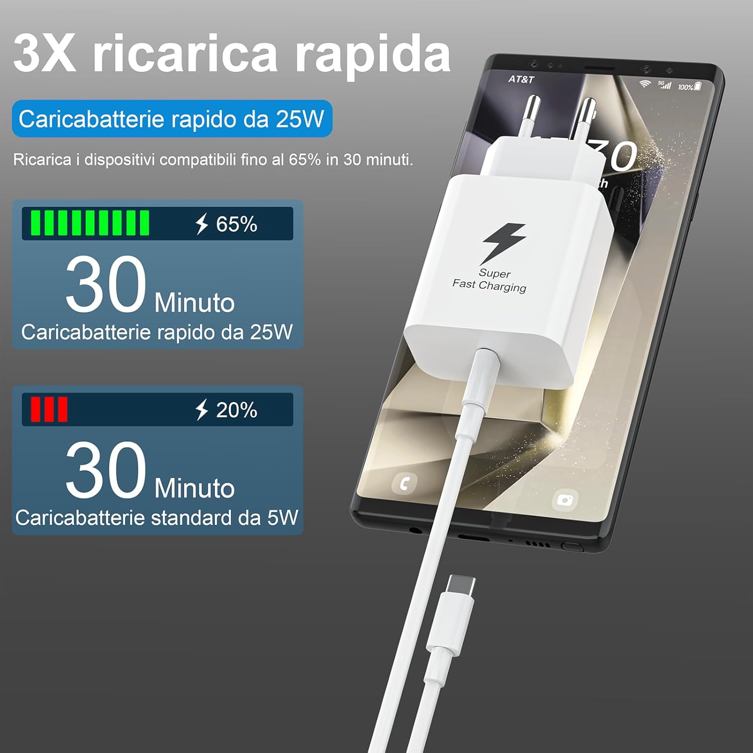 Caricatore rapido Samsung 25W USB C: questo caricatore USB C da 25W è progettato per la serie Samsung Galaxy, carica il vostro Samsung s23 Ultra rapidamente da 0 a 60% in circa 30 minuti, funziona in modo efficiente.