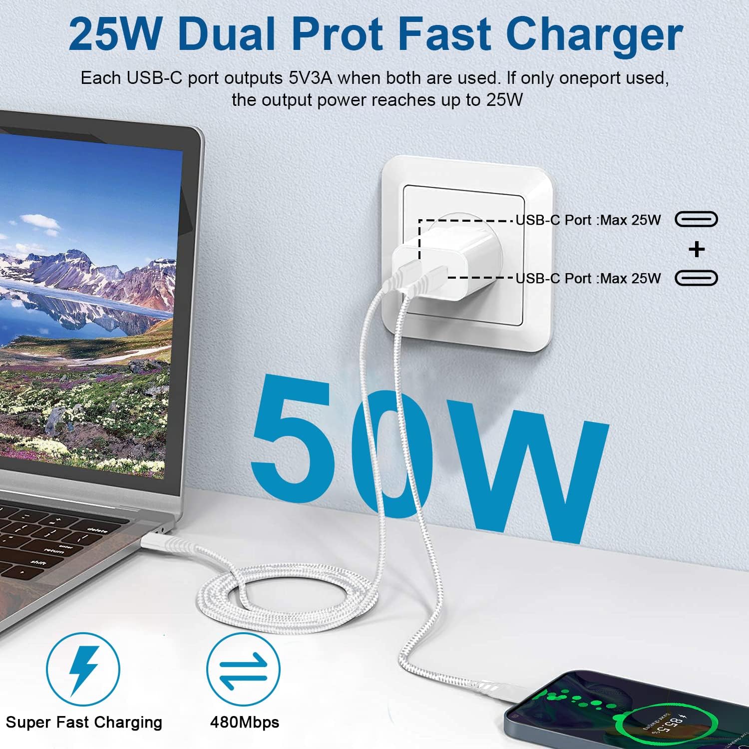 25W Caricatore con 2 Porte USB C +2M Cavo USB C a USB C