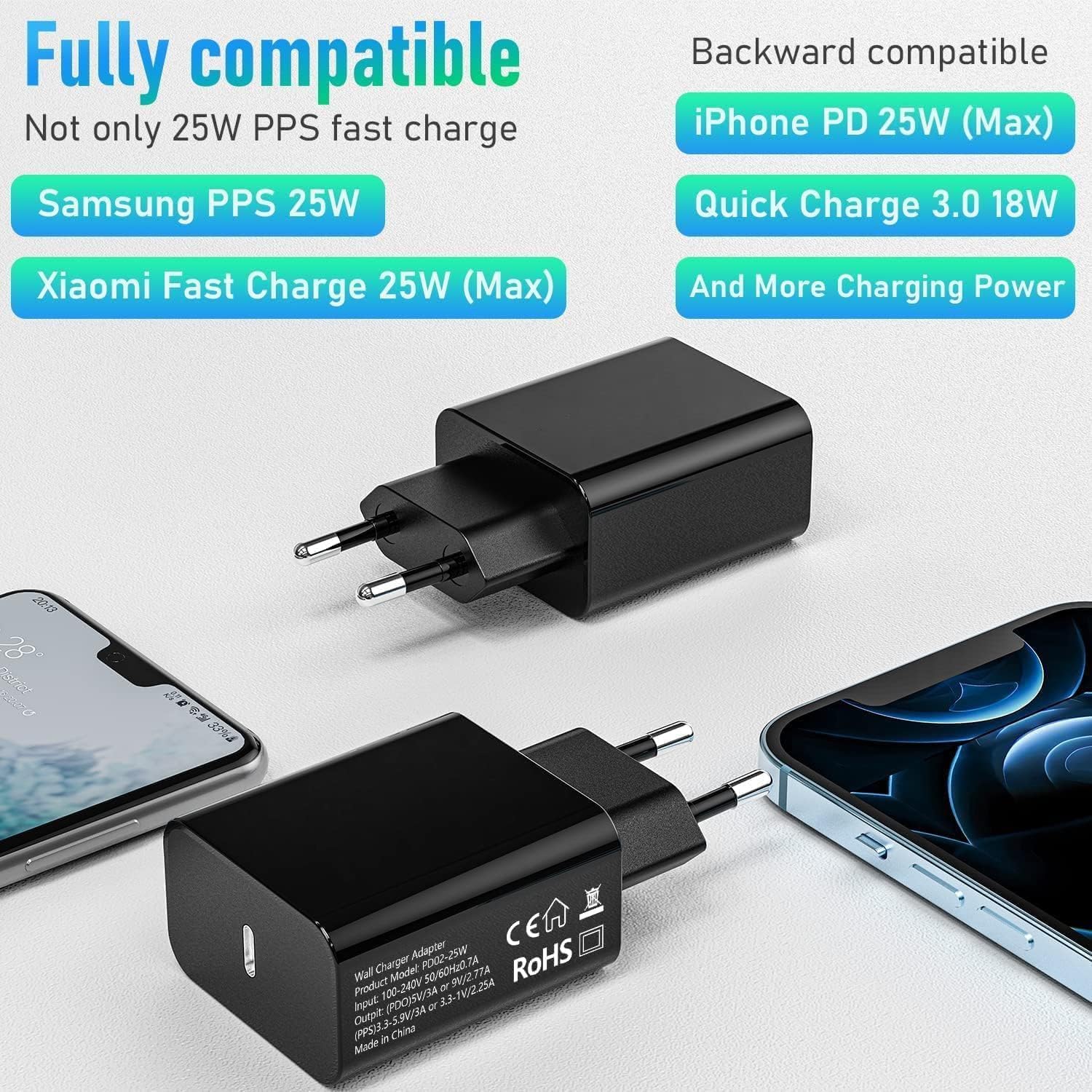 25W Caricatore USB C: Caricatore USB C 25W porta supporta la più recente tecnologia Fast Charge Power Delivery 3.0/Samsung PPS, ideale per ricaricare il vostro Samsung Galaxy,Xiaomi /iPhone a tutta velocità(Max 25W). Ad esempio, Samsung S23/S23+/S23 Ultra può essere caricato dallo 0% al 50% in soli 30 minuti.Supporta anche le tecnologie Quick Charge 4.0/3.0/2.0/Huawei FCP/Samsung AFC,BC 1.2 (5V/1.5 A o 5V/1A)