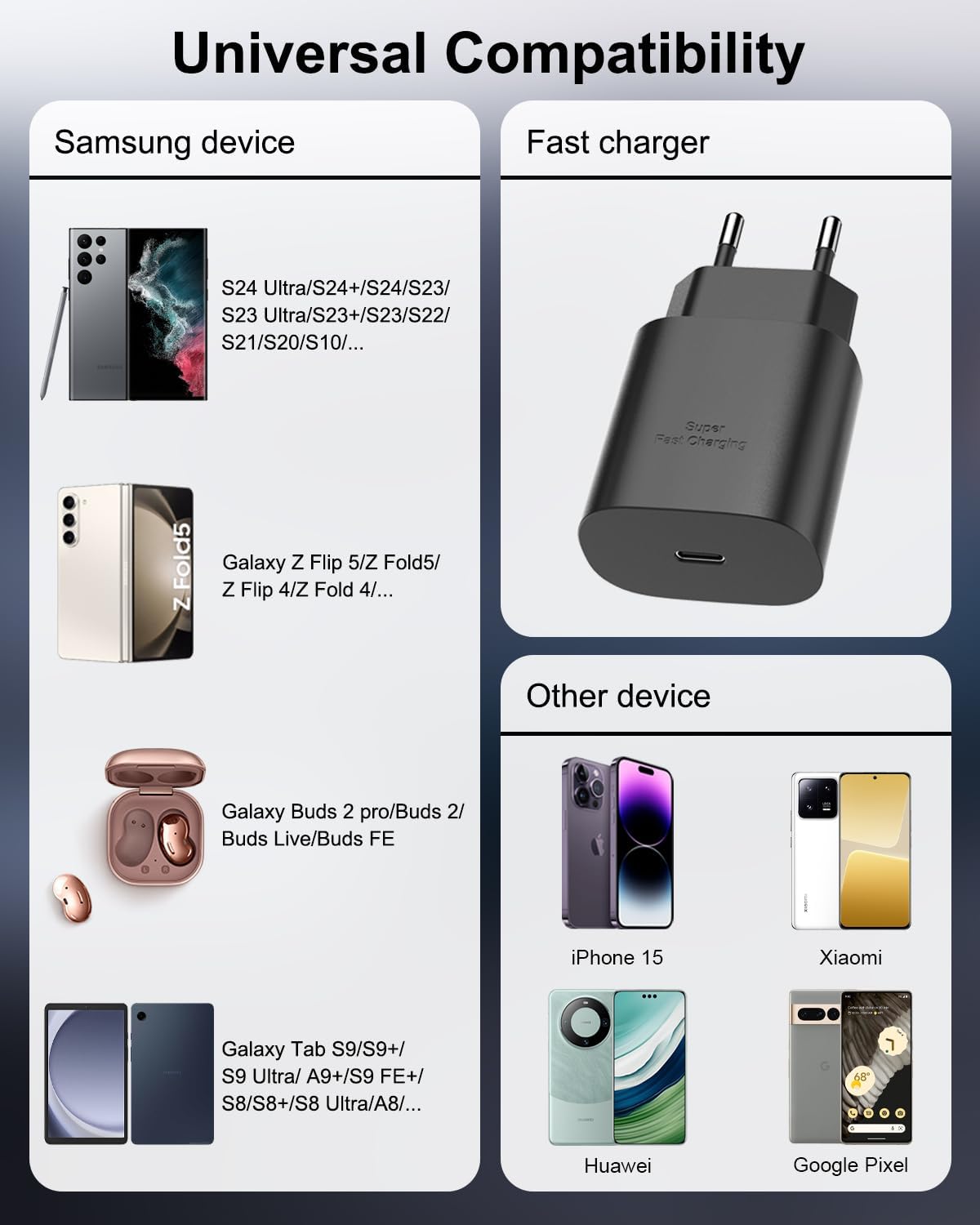 Caricatore Ampia Compatibilità: Il caricatore rapido USB C è adatto a un’ampia gamma di dispositivi intelligenti,compatibile con Samsung Galaxy S24 ultra,S24,S24+,S23 ultra,S23+,S23,S23 fe,S22 ultra,S22,S22+,S21 ultra,S21,S21FE,S20+,S20 Ultra,S20 FE,S20,S10,S9,S8, Note 20,Note 20 Ultra,Note 10,Note 9,Note 8,A14,A15,A25,A25 5g,A35,A35 5g,A55,A54 5G,A54,A53,A52,A51;Galaxy Fold 4, Fold 5, Filp 3, Filp 4, Filp 5;Galaxy Tablet Tab A9+/S9/S9 Ultra/S9 FE+/A8/S8/S8 e altri dispositivi di tipo C.