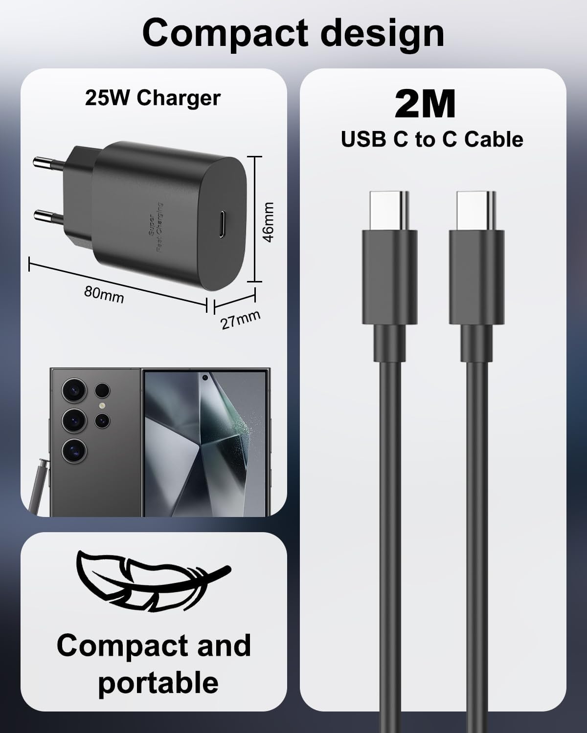 25W Caricatore USB C Rapido Con 2M Cavo per Samsung Galaxy S24/S23/S23 ultra/S23 FE/S22/S21FE/S20/A14/A15/A25/A35, Alimentatore USB C per Caricabatterie Samsung Fast Charger Type C Presa USB C Spina