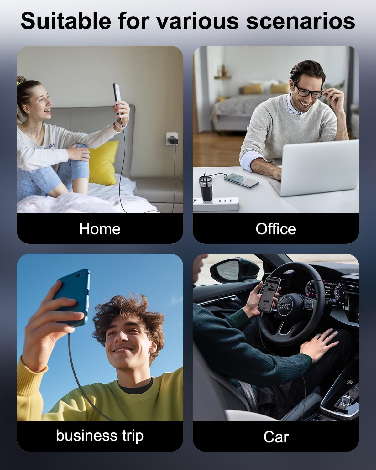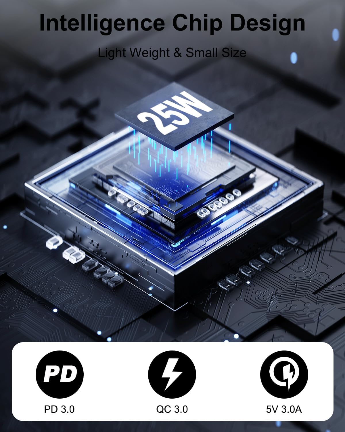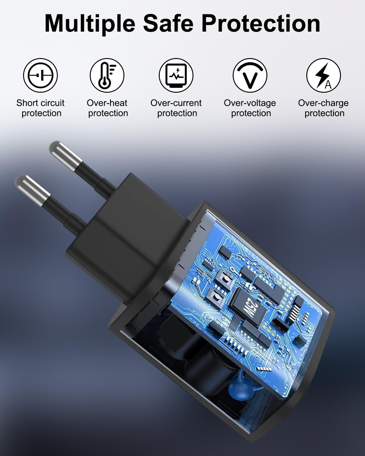 Il caricabatterie rapido è dotato di un chip IC intelligente che evita cortocircuiti, sovratensioni, surriscaldamento e sovracorrenti. Inoltre, interrompe la ricarica quando la batteria del dispositivo è piena, garantendo una ricarica più sicura del cellulare durante la notte.