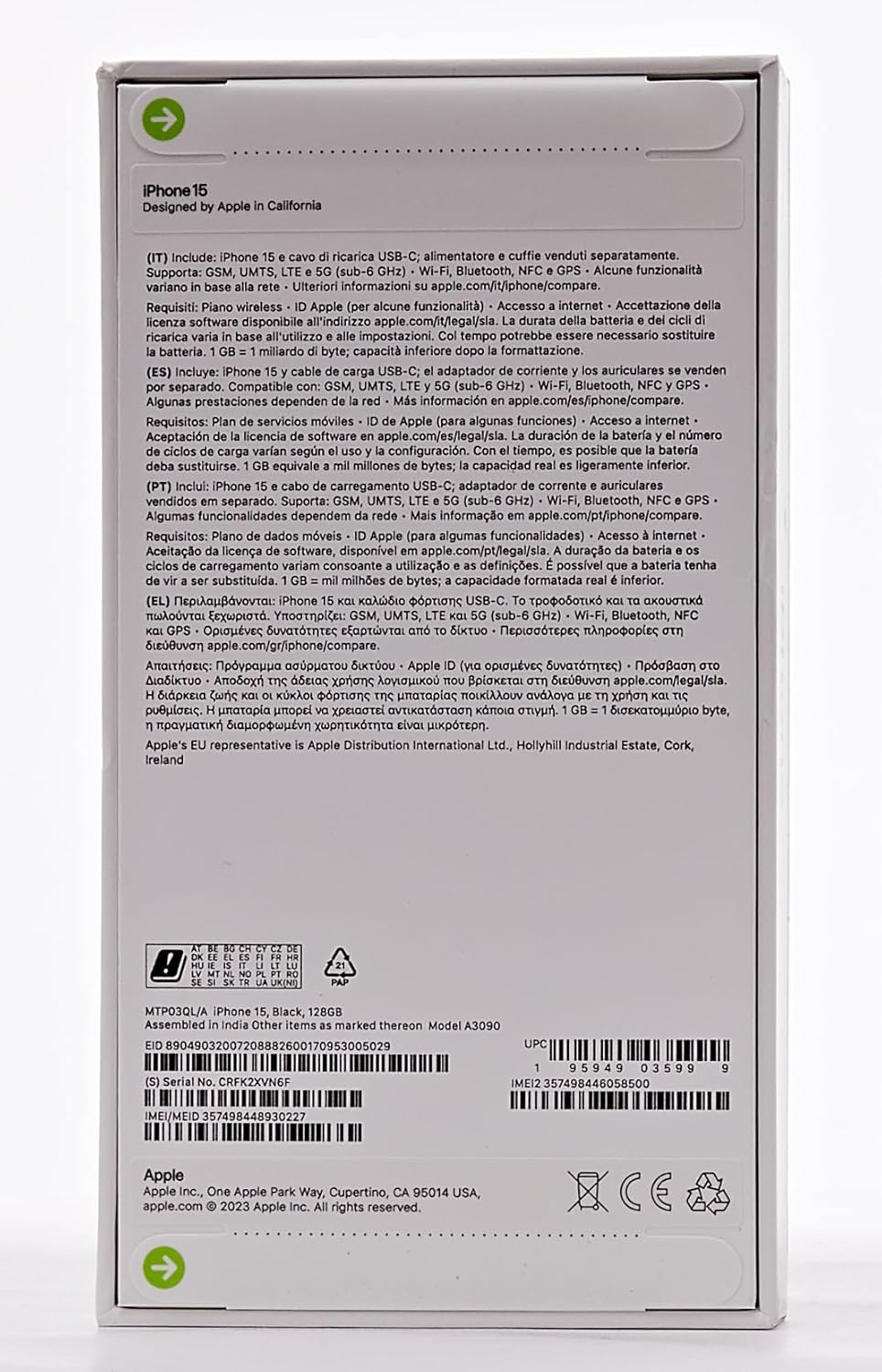Trovato in offerta ad un ottimo prezzo. Prodotto perfetto, confezione sigillata tramite strisce da strappare prima dellâapertura (quelle con le frecce verdi). Nellâottica di eliminare più possibile la plastica, oltre alla pellicola a sigillo della scatola, Apple ha eliminato anche la pellicola a protezione del vetro anteriore, che è diventata in carta. Il telefono è veramente molto bello, nero opaco. Nella confezione solo cavo USBC/USBC, senza alimentatore come ormai di consuetudine.