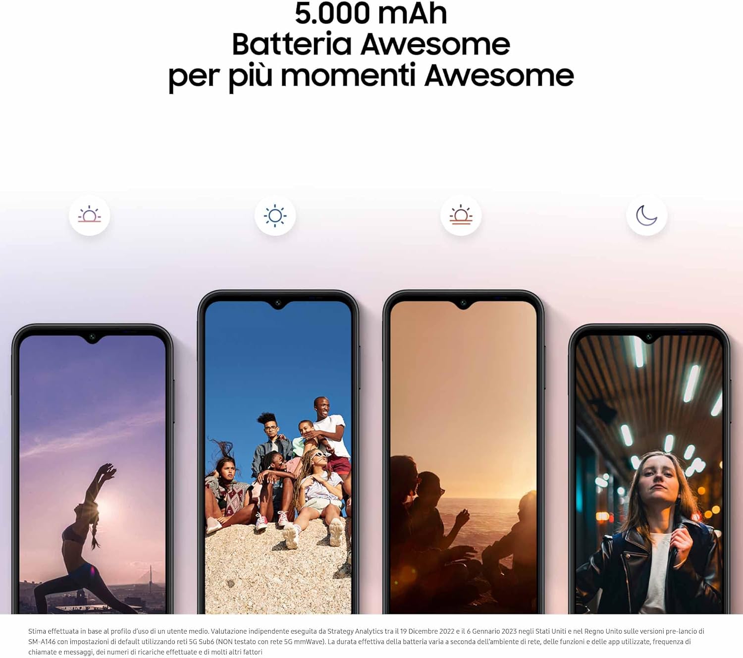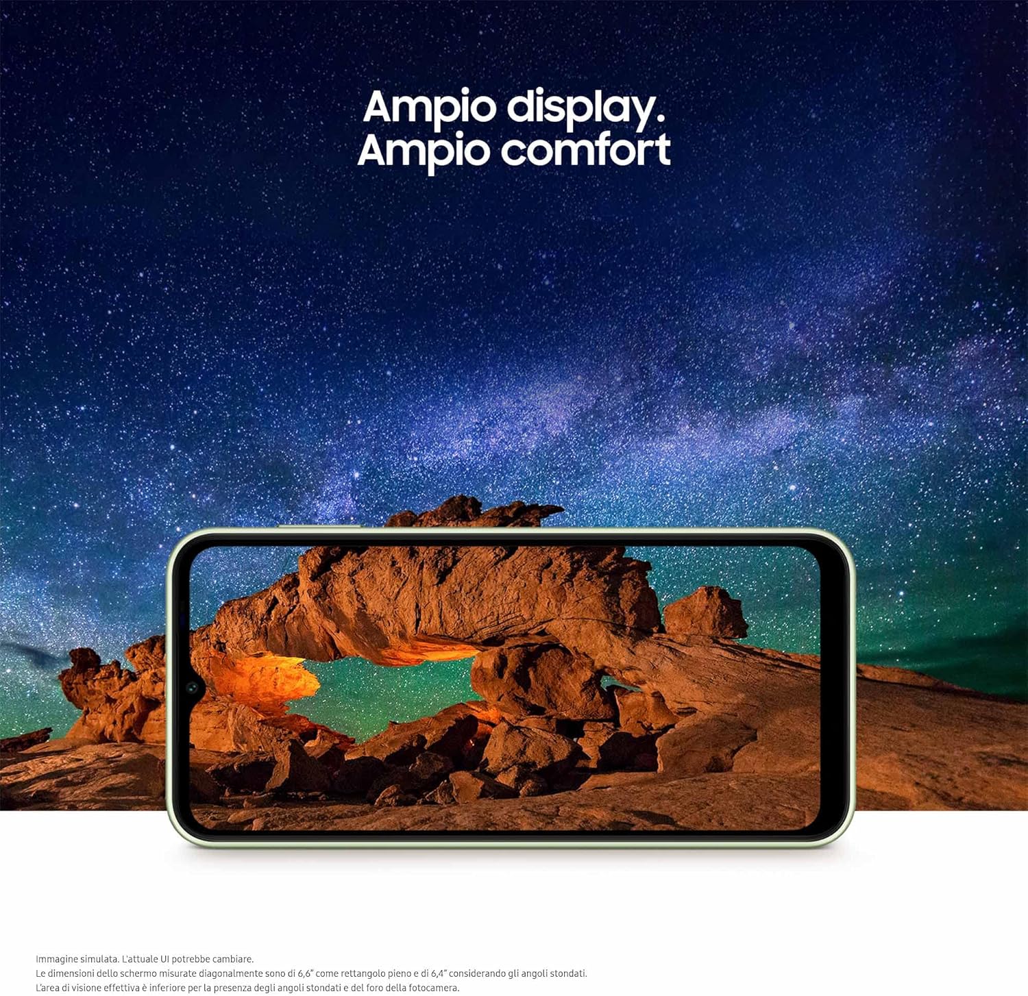 Le dimensioni dello schermo misurate diagonalmente sono di 6,6” come rettangolo pieno e di 6,4” considerando gli angoli stondati. L’area di visione effettiva è inferiore per la presenza degli angoli stondati e del foro della fotocamera.Valore tipico testato secondo condizioni di laboratori esterni. Il valore tipico è il valore medio stimato tenendo in considerazione la deviazione della capacità della batteria tra i campioni di batterie testati secondo lo standard IEC 61960. La capacità nominale è di 4.900 mAh.La disponibilità della rete 5G e la velocità effettiva possono variare in base a Paese, operatore di rete e ambiente di utilizzo.I modelli da 4/6/8 GB di RAM supportano fino a 4/6/8 GB di memoria interna che può essere usata come memoria virtuale per migliorare le prestazioni delle app.La capacità di memoria interna può variare a seconda del Paese o dell’operatore di rete.La durata effettiva della batteria varia a seconda dell’ambiente di rete, delle funzioni e delle app utilizzate, della frequenza di chiamate e messaggi, del numero di ricariche effettuate e di molti altri fattori. Stima effettuata in base al profilo d’uso di un utente medio. Valutazione indipendente eseguita da Strategy Analytics tra il 19 dicembre 2022 e il 6 gennaio 2023 nel Regno Unito sulle versioni pre-lancio SM-A146 con impostazioni di default, utilizzando le reti LTE e 5G Sub6.Immagine simulata a scopo illustrativo. L’effettiva interfaccia utente potrebbe variare rispetto all’immagine.