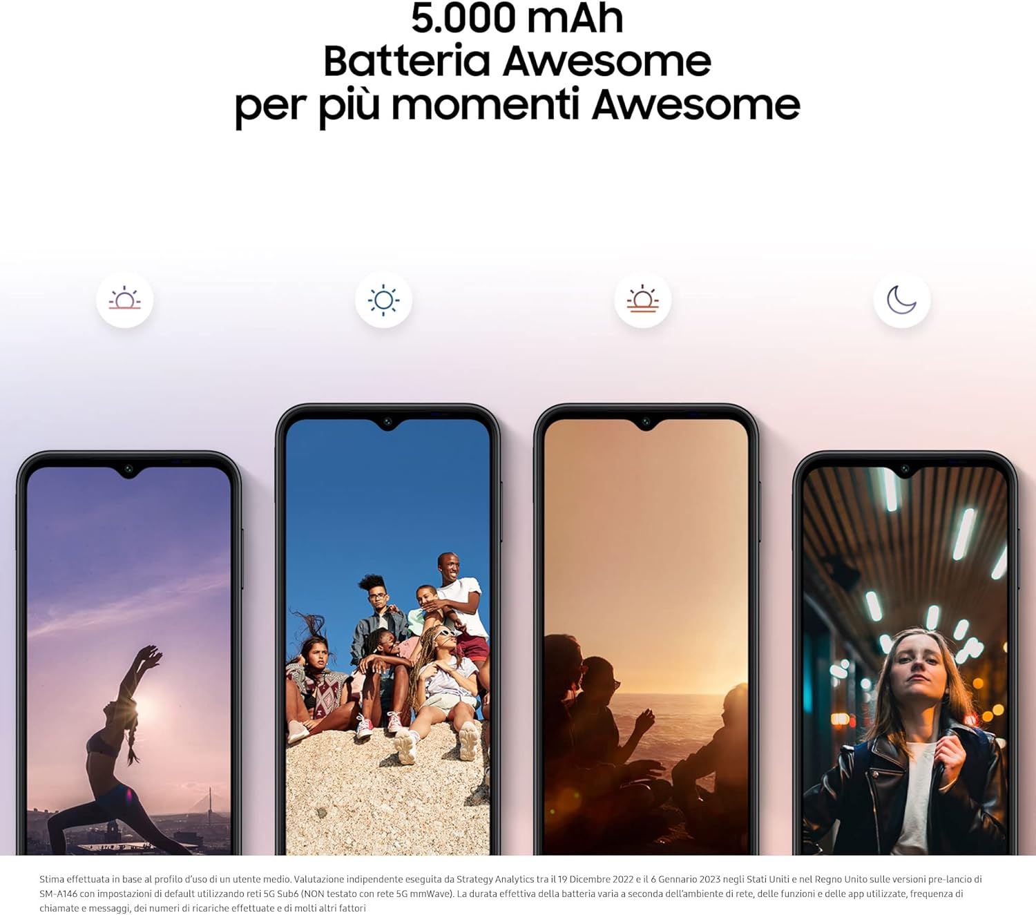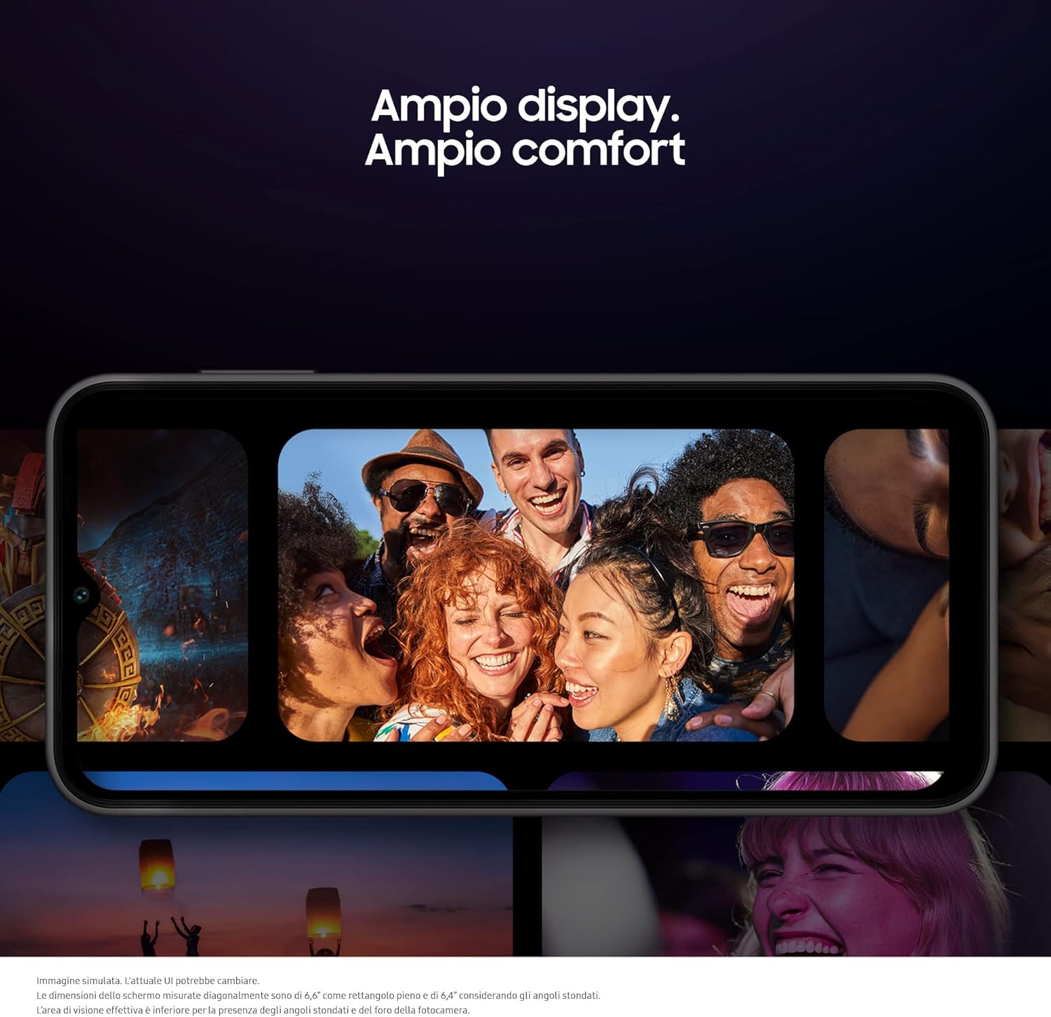 Le dimensioni dello schermo misurate diagonalmente sono di 6,6” come rettangolo pieno e di 6,4” considerando gli angoli stondati. L’area di visione effettiva è inferiore per la presenza degli angoli stondati e del foro della fotocamera.Valore tipico testato secondo condizioni di laboratori esterni. Il valore tipico è il valore medio stimato tenendo in considerazione la deviazione della capacità della batteria tra i campioni di batterie testati secondo lo standard IEC 61960. La capacità nominale è di 4.900 mAh.I modelli da 4/6/8 GB di RAM supportano fino a 4/6/8 GB di memoria interna che può essere usata come memoria virtuale per migliorare le prestazioni delle app.La capacità di memoria interna può variare a seconda del Paese o dell’operatore di rete.La durata effettiva della batteria varia a seconda dell’ambiente di rete, delle funzioni e delle app utilizzate, della frequenza di chiamate e messaggi, del numero di ricariche effettuate e di molti altri fattori. Stima effettuata in base al profilo d’uso di un utente medio. Valutazione indipendente eseguita da Strategy Analytics tra il 19 dicembre 2022 e il 6 gennaio 2023 nel Regno Unito sulle versioni pre-lancio SM-A146 con impostazioni di default, utilizzando le reti LTE e 5G Sub6.Immagine simulata a scopo illustrativo. L’effettiva interfaccia utente potrebbe variare rispetto all’immagine.