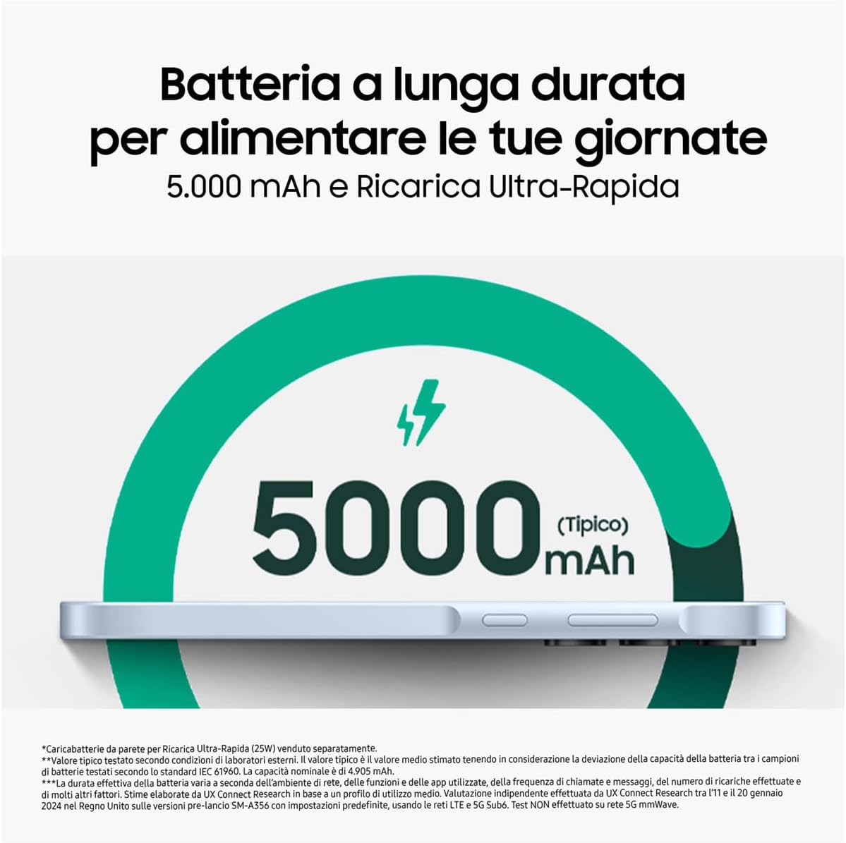 1_Le sequenze sono state accorciate e sono simulate. I risultati sono solo a scopo illustrativo. La disponibilità del servizio può variare a seconda della lingua e del modello del dispositivo. Richiede una connessione a internet. Potrebbe essere necessario aggiornare il software Android e l’app di Google alla versione più recente. Funziona su app compatibili. I risultati possono variare a seconda degli abbinamenti visivi. L’accuratezza dei risultati non è garantita. 2_Le dimensioni dello schermo misurate diagonalmente sono di 6,6” come rettangolo pieno e di 6,4” considerando gli angoli stondati. L’area di visione effettiva è inferiore per la presenza degli angoli stondati e del foro della fotocamera. 3_1.000 nit in modalità Alta Luminosità. 4_Il display di Galaxy A35 5G (SM-A356) ha ricevuto l’attestazione “Eye Care Display” di SGS per la capacità di limitare gli effetti dannosi della luce blu. 5_OIS: stabilizzatore d’immagine ottico. 6_VDIS: Video Digital Image Stabilization. 7_Valore tipico testato secondo condizioni di laboratori esterni. Il valore tipico è il valore medio stimato tenendo in considerazione la deviazione della capacità della batteria tra i campioni di batterie testati secondo lo standard IEC 61960. La capacità nominale è di 4.905 mAh. 8_La durata effettiva della batteria varia a seconda dell’ambiente di rete, delle funzioni e delle app utilizzate, della frequenza di chiamate e messaggi, del numero di ricariche effettuate e di molti altri fattori. Stime elaborate da UX Connect Research in base a un profilo di utilizzo medio. Valutazione indipendente effettuata da UX Connect Research tra l’11 e il 20 gennaio 2024 nel Regno Unito sulle versioni pre-lancio SM-A356 con impostazioni predefinite, usando le reti LTE e 5G Sub6. Test NON effettuato su rete 5G mmWave. 9_Galaxy A35 5G è attestato IP67. L’assegnazione del grado di protezione si basa su condizioni di prova in laboratorio che prevedono l’immersione in acqua dolce fino a 1 metro di profondità per un massimo di 30 minuti. Non indicata per l’uso in spiaggia o in piscina. La resistenza all’acqua e alla polvere del dispositivo non è permanente e può diminuire nel tempo a causa della normale usura. 10_EAL: Evaluation Assurance Level, livello di valutazione (CC, Common Criteria). Le funzioni di sicurezza e l’architettura hardware/software di Samsung Knox Vault sugli smartphone della serie Samsung Galaxy A possono variare rispetto a quelle dei dispositivi di punta Samsung Galaxy, inclusi gli smartphone delle serie S, Z, S FE e i tablet della serie Tab S lanciati sul mercato a partire dal 2021. 11_Le funzioni di sicurezza e l’architettura hardware/software di Samsung Knox Vault sugli smartphone della serie Samsung Galaxy A possono variare rispetto a quelle dei dispositivi di punta Samsung Galaxy, inclusi gli smartphone delle serie S, Z, S FE e i tablet della serie Tab S lanciati sul mercato a partire dal 2021. 12_La disponibilità di Samsung Knox Vault può variare a seconda del Paese o del modello di dispositivo. 13_Le politiche di aggiornamento del sistema operativo e della sicurezza sopra indicate sono soggette a modifiche. 14_La disponibilità e le tempistiche di aggiornamento di One UI e delle sue funzioni possono variare in base al modello e al programma di aggiornamento del sistema operativo Android. 15_Le opzioni di memoria/archiviazione e relativa disponibilità possono variare a seconda del Paese, della regione o dell’operatore di rete. 16_Lo spazio di memoria/archiviazione disponibile può variare a seconda del software pre-installato. 17_Scheda microSD venduta separatamente.