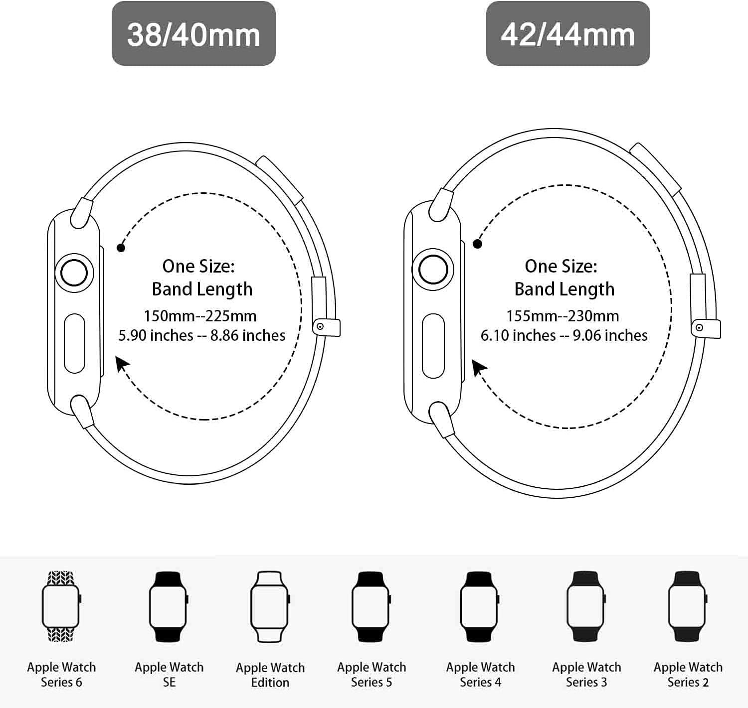 38mm/40mm/41mm/42mm(Series 10) si adatta a 5.9″- 8.86″(150mm-225mm) polso