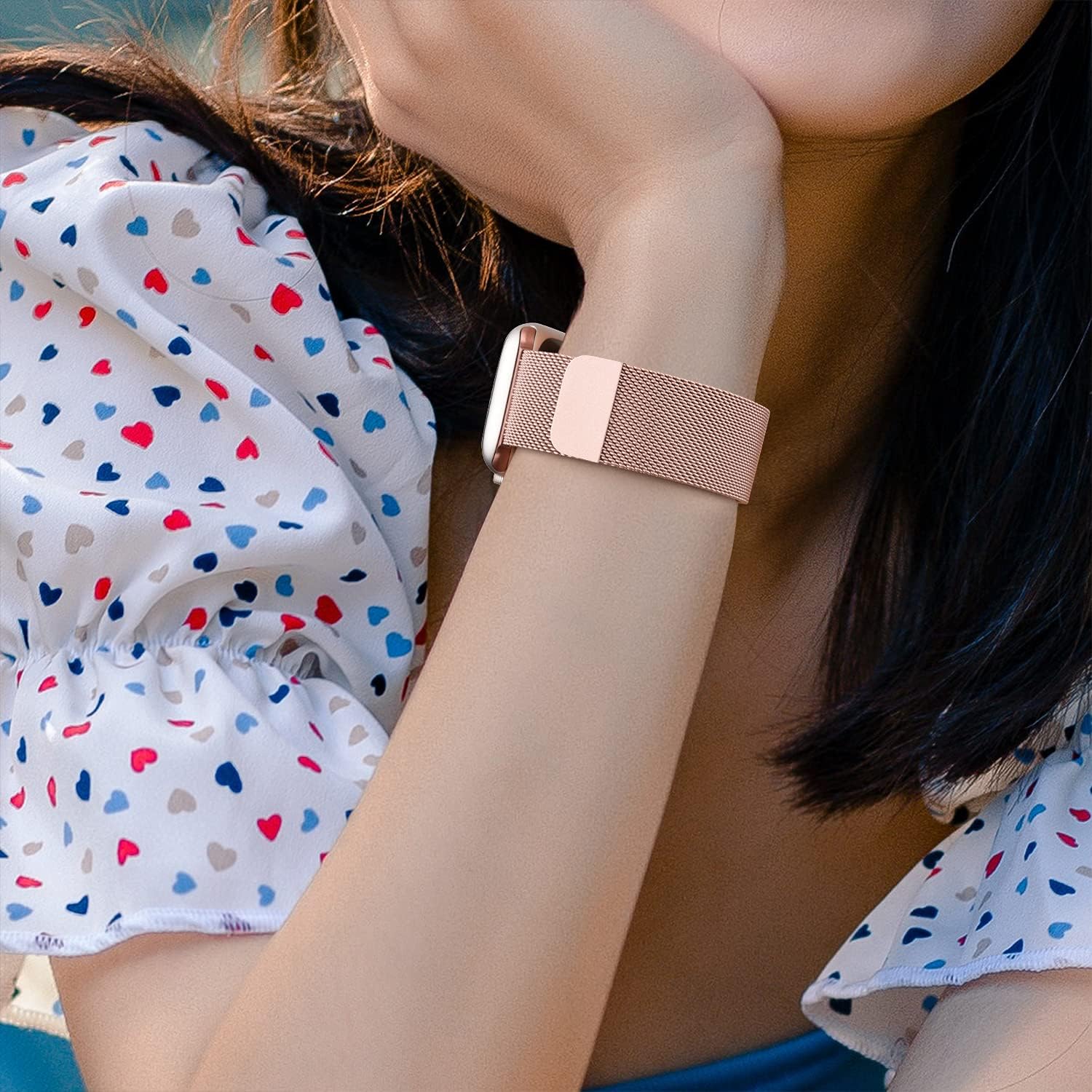 Ho indossato subito il cinturino che ho acquistato (spedizione super veloce). Devo dire che è molto carino, leggero e facile da mettere. Ero titubante quando lâho acquistato per via delle calamite, pensavo fosse facile a sganciarsi, invece devo dire che ne ha ben 2 calamite e poi il cinturino è a bracciale, non si apre come un normale orologio. Molto molto carino. Lâunica pecca è il colore, non è propriamente uguale alla cassa dellâ IWatch come potete dalla foto.