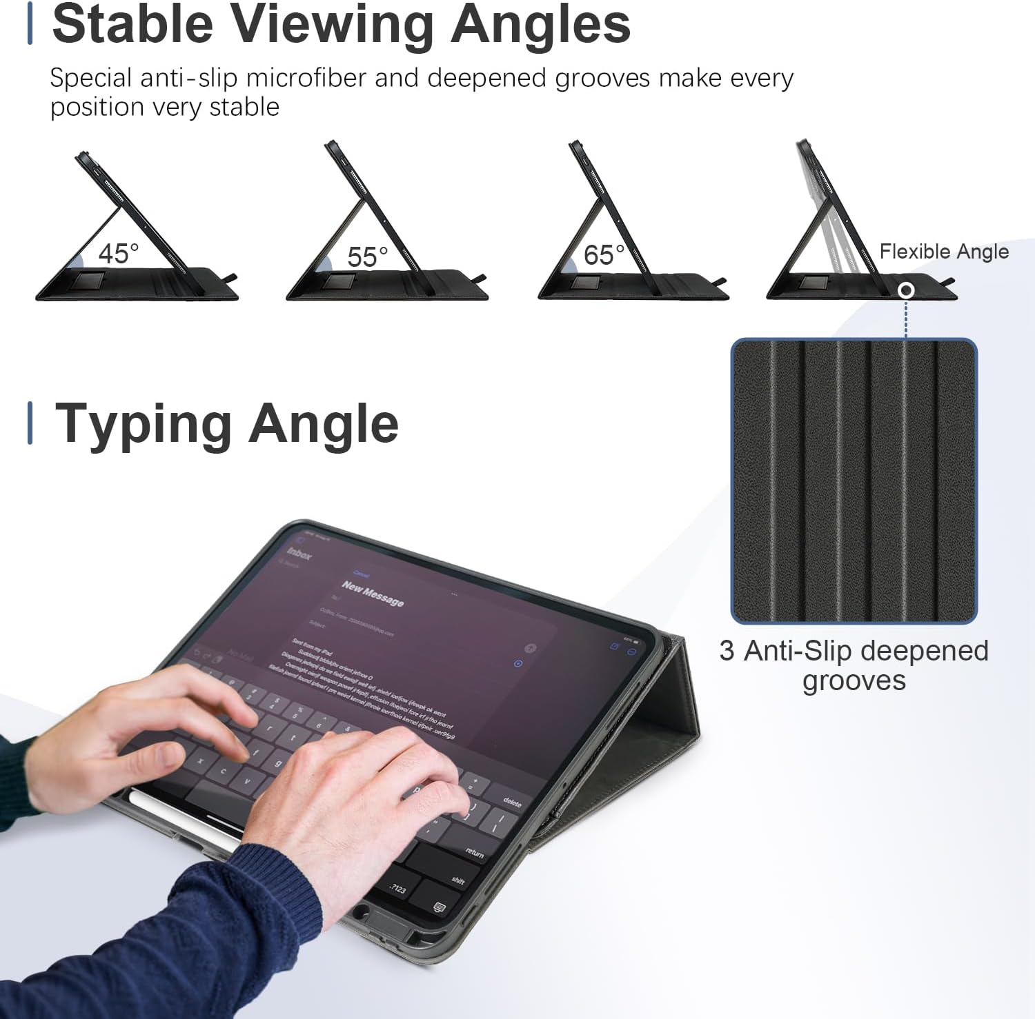 Stabile 4 Angoli di Supporto: La custodia iPad Pro 13 Pollici M4 2024 offre 3 angoli di visione e 1 angolo di digitazione,La facilità di regolazione del supporto a varie angolazioni ha migliorato significativamente l’esperienza e il comfort di visualizzazione/digitazione/disegno. La speciale microfibra antiscivolo e le scanalature approfondite rendono ogni posizione molto stabile